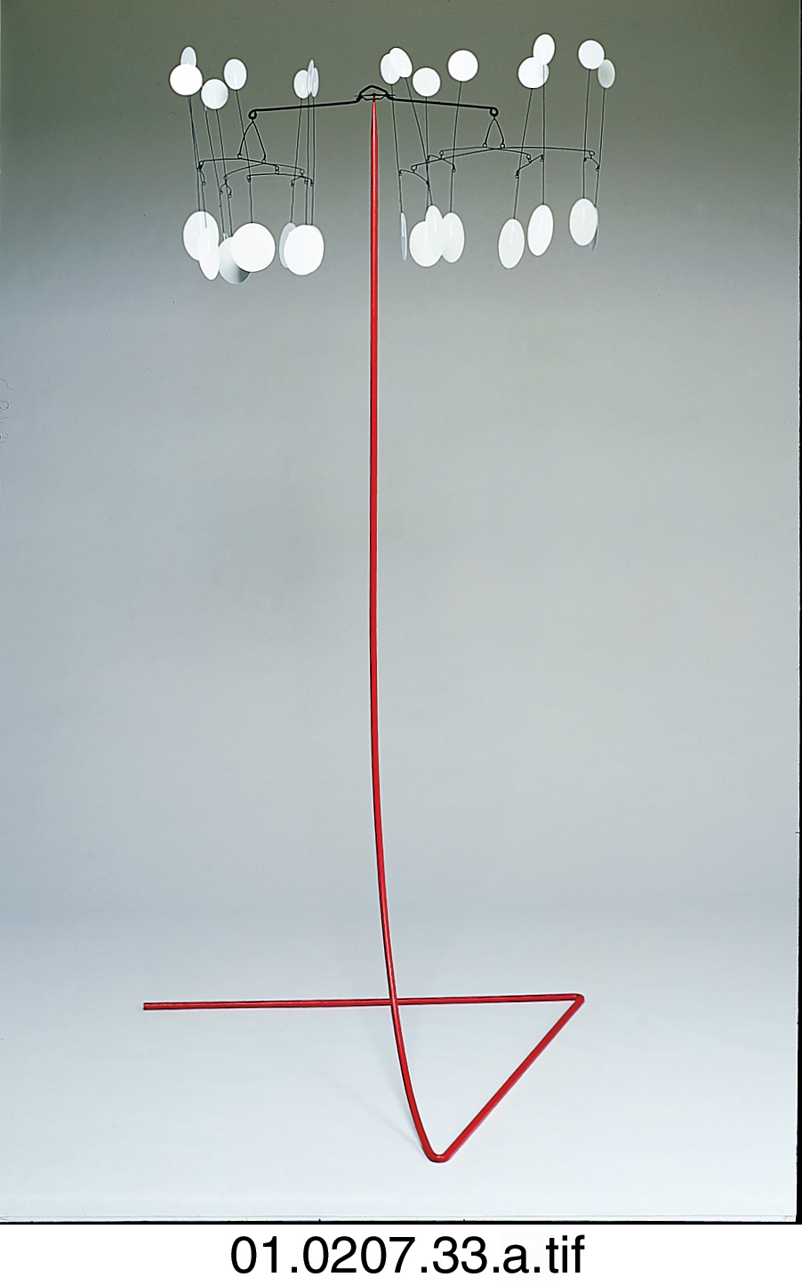 In the fall of 1931, a significant turning point in Calder’s artistic career occurred when he created his first truly kinetic sculpture and gave form to an entirely new type of art. The first of these objects moved by systems of cranks and motors, and were dubbed “mobiles” by Marcel Duchamp—in French mobile refers to both “motion” and “motive.” Calder soon abandoned the mechanical aspects of these works when he realized he could fashion mobiles that would undulate on their own with the air’s currents. Jean Arp, in order to differentiate Calder’s non-kinetic works from his kinetic works, named Calder’s stationary objects “stabiles.”