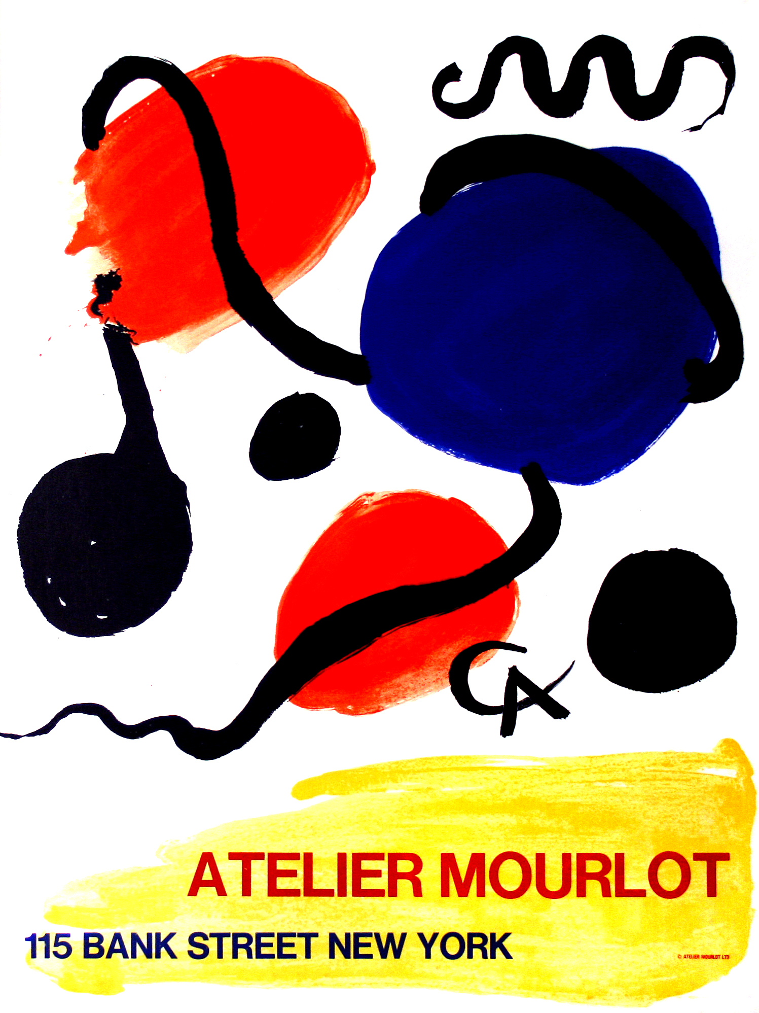 The forties and fifties were a remarkably productive period for Calder, which was launched in 1939 with the first retrospective of his work at the George Walter Vincent Smith Gallery in Springfield, Massachusetts. A second, major retrospective was exhibited at the Museum of Modern Art in New York just a few years later, in 1943. In 1945, Calder made a series of small-scale works; in keeping with his economy, many were made from scraps of metal trimmed while making larger pieces. While visiting Calder’s studio about this time, Duchamp was intrigued by these small works. Inspired by the idea that the works could be easily dismantled, mailed to Europe, and re-assembled for an exhibition, he planned a Calder show at Galerie Louis Carré in Paris. This important show was held the following year and Jean-Paul Sartre wrote his famous essay on Calder’s mobiles for the exhibition catalogue. In 1949, Calder constructed his largest mobile to date, International Mobile, for the Philadelphia Museum of Art’s Third International Exhibition of Sculpture. He designed sets for “Happy as Larry,” a play directed by Burgess Meredith, and for Nucléa, a dance performance directed by Jean Vilar. Galerie Maeght in Paris also held a Calder show in 1950, and subsequently became Calder’s exclusive Parisian dealer. His association with Galerie Maeght lasted twenty-six years, until his death in 1976. After his New York dealer Curt Valentin died unexpectedly in 1954, Calder selected the Perls Gallery in New York as his new American dealer, and this alliance also lasted until the end of his life.
