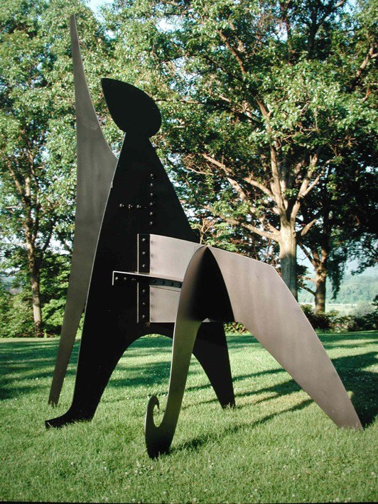 Calder’s earliest attempts at large, outdoor sculptures were also constructed in this decade. These predecessors of his later imposing public works were much smaller and more delicate; the first attempts made for his garden were easily bent in strong winds. Yet, they are indicative of his early intentions to work on a grand scale. In 1937, Calder created his first large bolted stabile fashioned entirely from sheet metal, which he entitled Devil Fish. Enlarged from an earlier and smaller stabile, the work was exhibited in a Pierre Matisse Gallery show, Stabiles and Mobiles. This show also included Big Bird, another large work based on a smaller maquette. Soon after, Calder received commissions to make both Mercury Fountain for the Spanish Pavilion at the Parisian World Fair (a work that symbolized Spanish Republican resistance to fascism) and Lobster Trap and Fish Tail, a sizable mobile installed in the main stairwell of the Museum of Modern Art in New York.