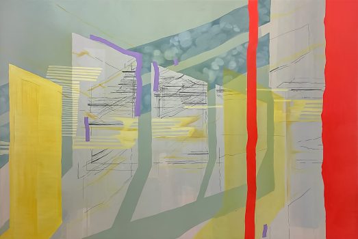 Alexandria Wallace’s abstract paintings use photographs and less concrete sources such as sound, movement, and light to document place. “I am constantly shifting my specific mark making vocabulary,” she says. “Currently, my pieces investigate sites around Los Angeles. I am drawn to the mundane elements in the city- layered paint, shadows, dappled light, the speed of cars and architecture. All of these elements are simplified and reduced into fragments and color fields that I construct into a painting. Ultimately, this process creates a new location to be dissected by the viewer.”
