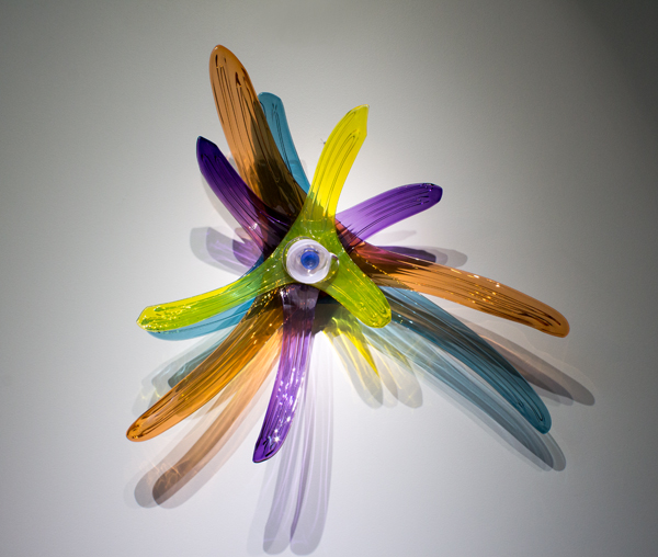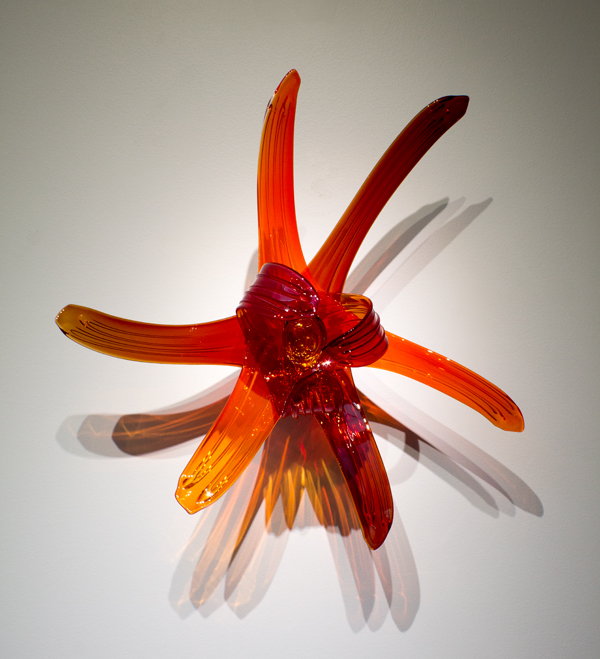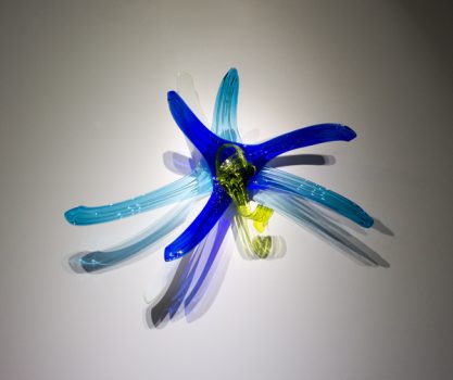 April Wagner sculpts molten glass that is “captivating to look at in [its] environment.” Wagner determines the colors, shapes, and scale of her work based on its desired location—whether for a public, private, or corporate space. Utilizing a modern-day variation of the traditional Italian fazzoletto (handkerchief) design, she blows glass into fluid, organic shapes without over-tooling or impairing it. Wagner said: “By turning, twisting, or repeating the shapes, I investigate their relationship to floor, wall, or tabletop. In creating multiples and assembling the shapes together, almost like found objects, I create large pieces. I use color to push and pull the eye around or up and down the piece.”
