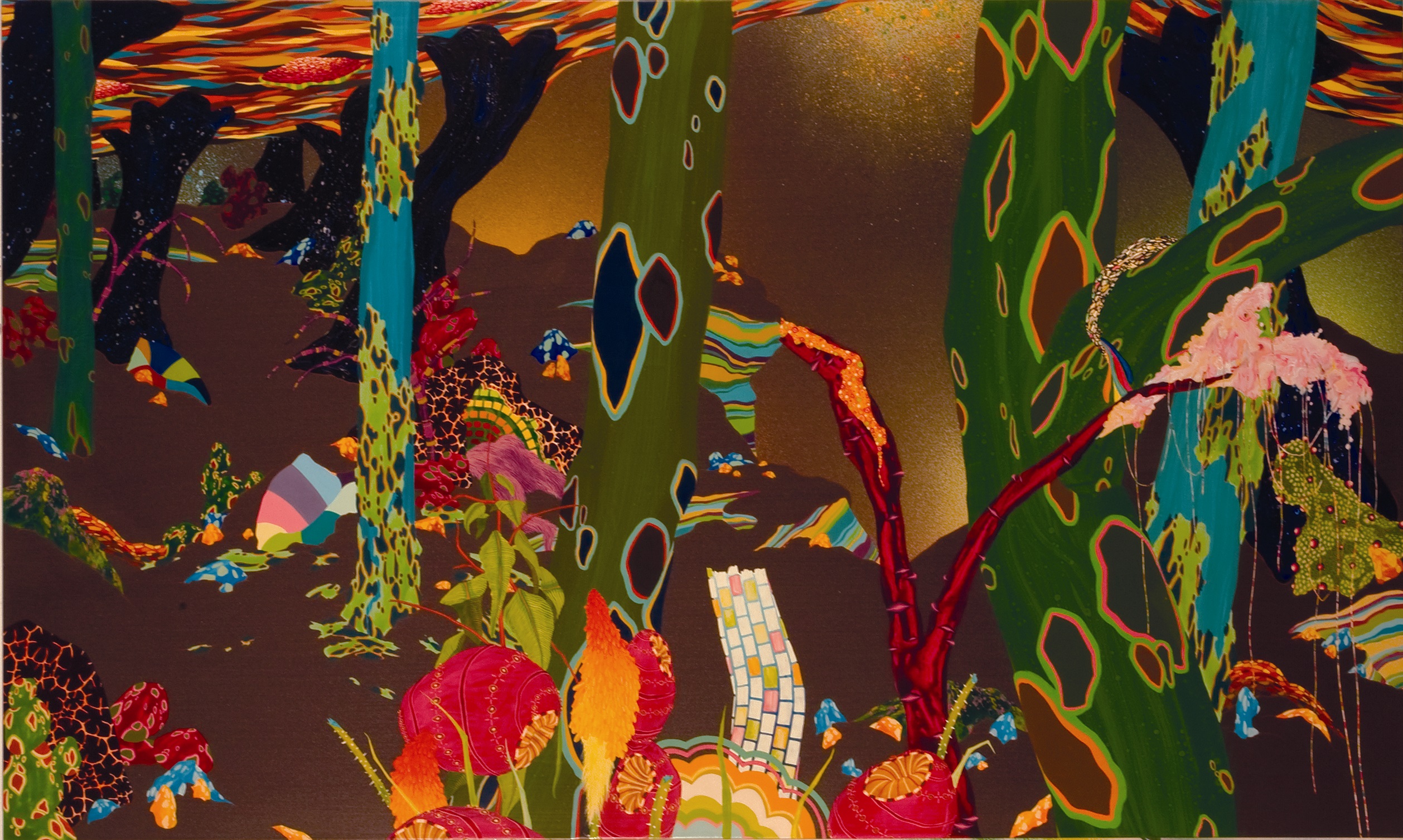 Of his work, Beau Chamberlain says, “My work focuses on creating abstract environments populated by luminous flora and fauna that exist somewhere in between reality and fantasy. Large uninhabited spaces are neither empty, nor a backdrop, but assert themselves as palpable atmospheres. They are an exploration of mutation, imitation and definability in seemingly serene environments. Made with acrylic on wood panels, the paintings create ambiguous settings in which time, place and scale remain undefined.”