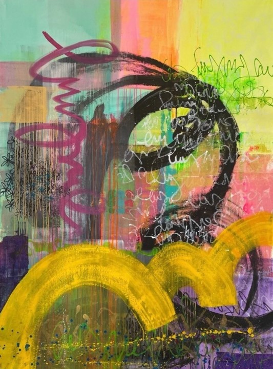 Bojana Ilic, who goes by BOJITT professionally, is a multidisciplinary artist who creates dynamic, abstract compositions executed in a variety of mixed media such as acrylic and spray paint. “Each artwork holds its own bespoke symbolic language suited to its story. Shapes become characters, drops and splashes direct the flow of energy and action. My own handwriting punctuates every tale with an exclamation point…My abstractions dance towards the liminal space where passion, moments, and music meet the concrete: color, texture, and details,” she says.