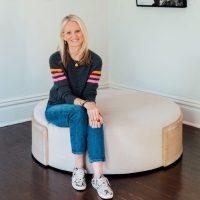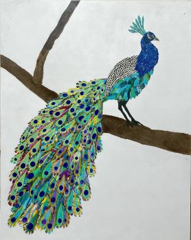 Brenda Bogart constructs mixed-media collages “defined by her signature sense of color, pattern, and texture.” Many of her pieces use found objects and paper collected from her travels; she also integrates hand-lettered antiques and ephemera from Paris.