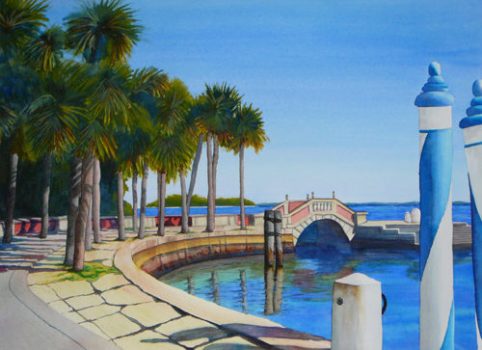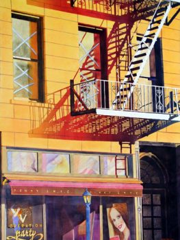 Vizcaya (2010) and 26th and Federal (2010) are two of Wolford’s earlier works depicting the intense colors of his adopted home state of Florida. Operation Party (2014) – a street scene from Manhattan – served as the centerpiece of his “Shadow Journeys” exhibit.
