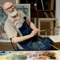 Over a career spanning more than sixty years, Donald Vogel was profoundly influenced by impressionism and post-impressionism. Vogel painted interiors, still lifes, and landscapes such as From Above, in which figures often appear engaged in subtle movement. He began each work with a sketch, then recreated elements of the drawing on canvas or panel using burnt umber or raw sienna thinned with turpentine. From there, he established the structure of the composition before painting more freely with color. His brushwork was quick and direct, rhythmically flowing between palette and canvas often in sync with the music playing in the background. When asked how he approached an unsuccessful painting, Vogel said, “Never be afraid to paint a bad painting, you learn as much from a bad painting as one that was successful.”