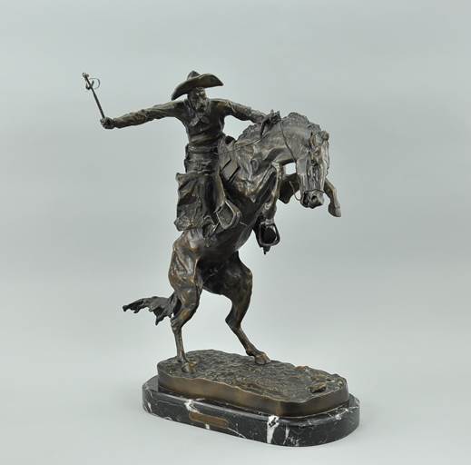 Many of Remington’s paintings intended for illustration were rendered in monochromatic tones, simplifying the process of transferring them into print. Additionally, black-and-white compositions would have heightened a viewer’s sense of reportage through the paintings’ visual similarities to photographs. Another defining aspect of Remington’s oeuvre is the emotional power with which he painted horses in motion. Compositions in which riders on horseback seem to rush out of the picture plane toward the viewer proved popular with his audience.