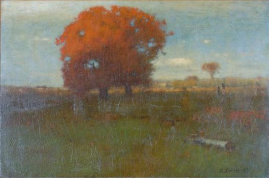 Born in Newburgh, New York, in 1825, George Inness was raised in New York City and Newark, New Jersey. His early life was disrupted by severe illness, and as a result, he had little formal academic or artistic education. In Newark, he studied with the itinerant painter John Jesse Barker, and in New York City, probably in 1843, with the French-born landscape painter Régis François Gignoux. Inness traveled to Italy in 1850. In 1853 he visited France, where he studied French Barbizon landscape painting, admiring especially the work of the most radical of the Barbizon artists, Théodore Rousseau. This was the most decisive influence on