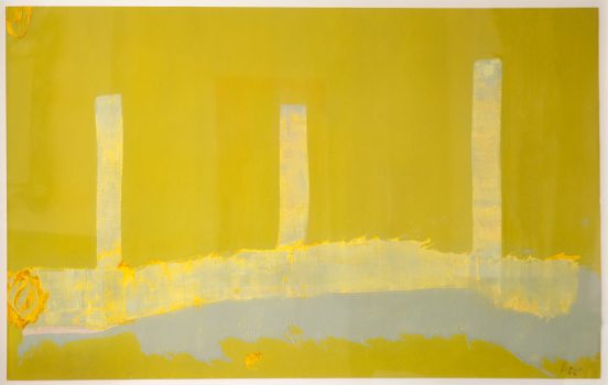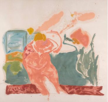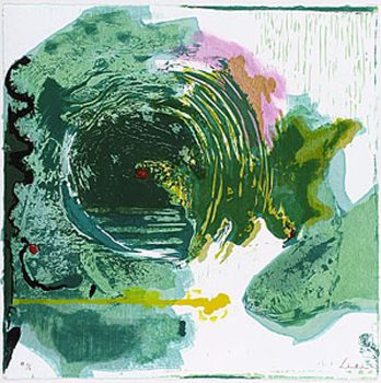 Helen Frankenthaler was a pioneering female artist in the male-dominated sphere of mid-twentieth-century abstract painting. She is best known for her “soak-stain” process, which entailed pouring thinned paint onto an unprimed canvas to create fields of translucent color. Often, these paintings referenced figuration and landscape, expanding the strict nonfigurative boundaries of abstract expressionism. In addition to her painting practice, Frankenthaler experimented with various printmaking methods.