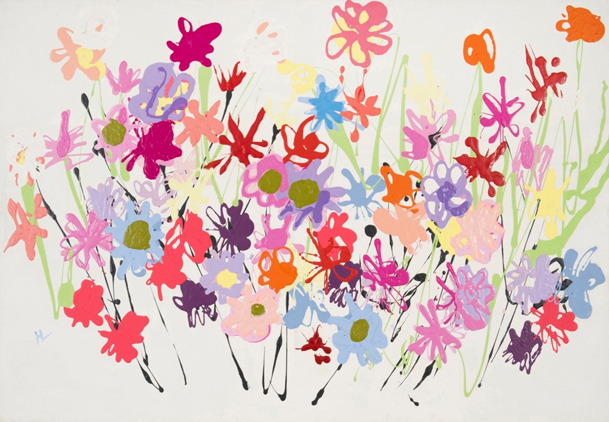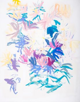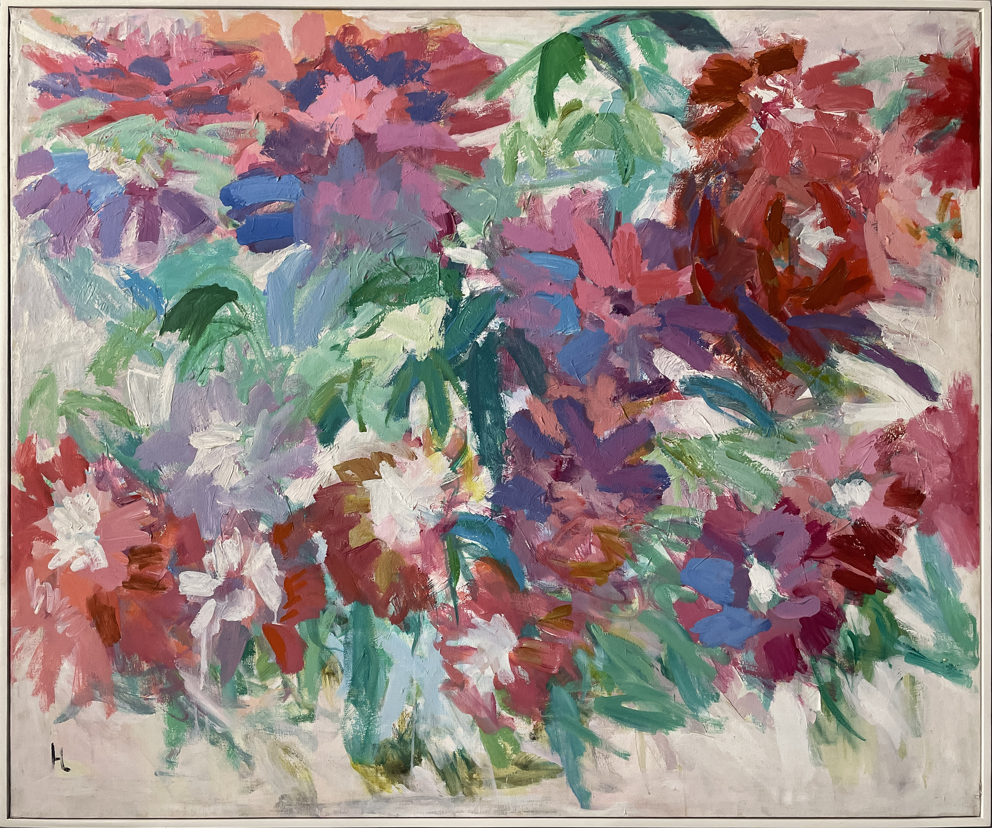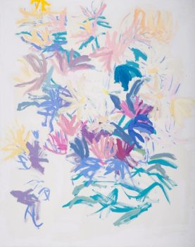 Helen Grigware Lambert’s early paintings were figurative and rendered in a dark palette, but by 1970, her style had become increasingly abstract, with lively colors and passages of white. Thin, delicate lines of dripped paint spread and interlace about the canvas, defining the flowers that had become her subject of choice and that her titles reference. In addition to being an artist, Lambert was also a lawyer and the first woman to graduate from the Gonzaga University School of Law in Spokane, Washington, in 1937. Lambert traveled around the world extensively during her law career, including to Japan, the former Soviet Union, and Israel; those countries left an indelible impression on her artistic vision.