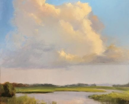 Jacki Newell grew up near Omaha, Nebraska, where she started painting as a teenager. Newell’s painting practice was heavily influenced by the vast landscape of the prairie, and since moving to South Carolina nearly twenty years ago, she has drawn upon the beauty of the marshes and atmospheric skies of her home. An oil painter who frequently paints en plein air, Newell enjoys the challenge of capturing the light of her surroundings to allow viewers to feel the humidity and warmth of coastal South Carolina.