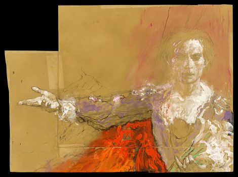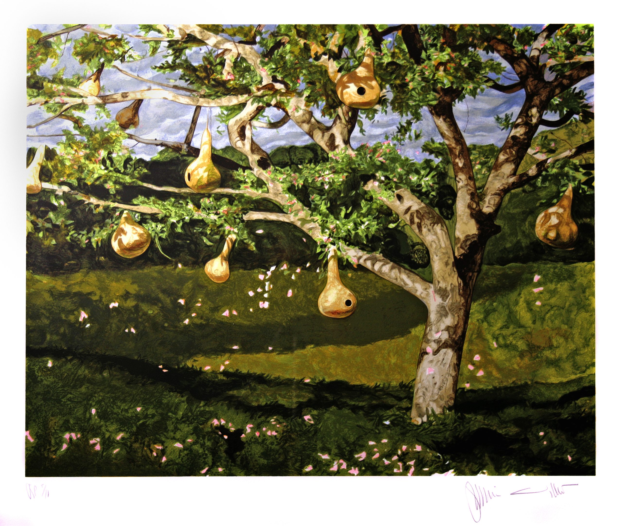 Contemporary realist painter Jamie Wyeth is part of the artistic dynasty ushered in by his grandfather, N.C. Wyeth, and father, Andrew Wyeth. His body of work—portraiture and landscapes with domestic animals and livestock—is known “for its distinctive subject matter and its remarkable technical expertise.” Unlike his father, Wyeth paints in a traditional, realist style but with a diverse and vivid color palette, mixing media to apply and create “complex effects of surface and texture.”
