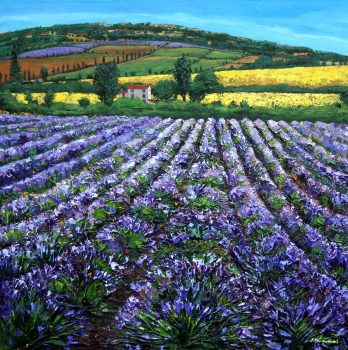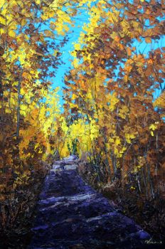 With their extreme texture, and colors just brighter than reality, Jennifer Vranes’s paintings capture an intense energy that is both positive and uplifting. An extensive world traveler, she draws inspiration from places she has seen. Through her art, she transports the viewer to distant lands where poppies grow wildly in breathtaking meadows; where fragrant lavender is farmed in lush rows in France; and where aspens quake in the Rocky Mountains. Vranes finds the secret utopias that often go unnoticed, and she captures them on canvas for the world to enjoy. Blending the traditional and the contemporary, Vranes has developed a technique that involves a dramatic use of texture. What is smooth or textured in life has the same characteristics in her paintings. The sky or distant mountains, for example, are flat and smooth, while the thick trunks of trees, or grasses in the foreground have a real life-like texture. This contrast gives a distinctive three-dimensional effect to her paintings.