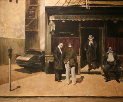 John Hardy’s urban paintings use New York City as subject matter to make a general commentary on aspects of contemporary urban culture and especially about excessive consumerism highlighted by advertising of luxury items, high fashion, electronic services, etc. In recent years his concentration has focused on the monumental screen prints attached to high rise building walls which have become a surreal blight in cityscapes worldwide.