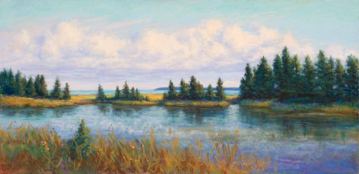 Kathleen Kalinowski is known for her poetic interpretations of the Michigan landscape. Her oil and pastel paintings “explore the nuances of nature with layers of color in a contemporary, impressionist style.” Her artistic process involves composing a sketch or drawing, determining the subject of her composition, and loosely painting large shapes for two to three hours, “working dark values to light and leaving any details until the end.” Her paintings explore the nuances of nature inspired by working outside on location in all seasons.