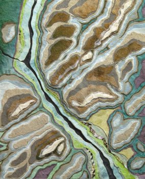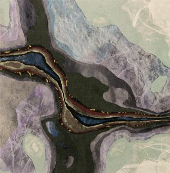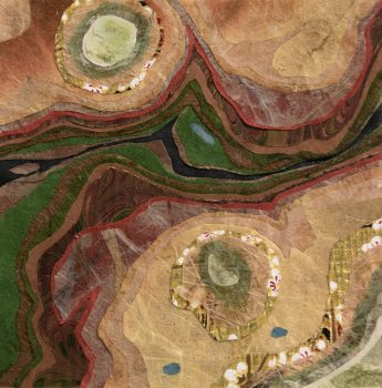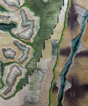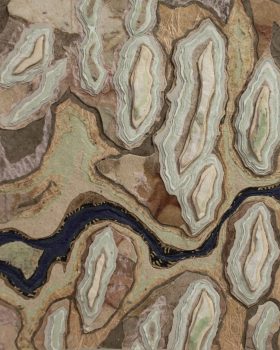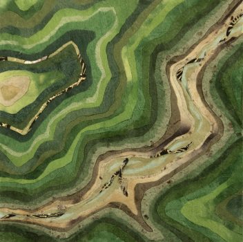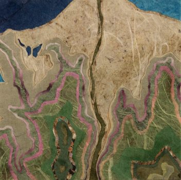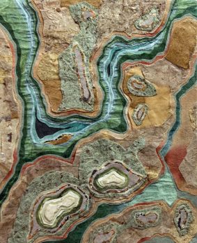 Laura Cannamela’s work explores the process of landscape formation. Crafted with layers of handmade paper, her collage sculptures are inspired by her firsthand observations of nature and study of topographical maps. “Making a connection between the landscape created through erosion by natural forces and the sculpture created through cutting away layers of paper or clay is fundamental to my practice. In all my sculptures, as in nature, the process of layering indicates a state of transformation, becoming a record of change through time,” she said.