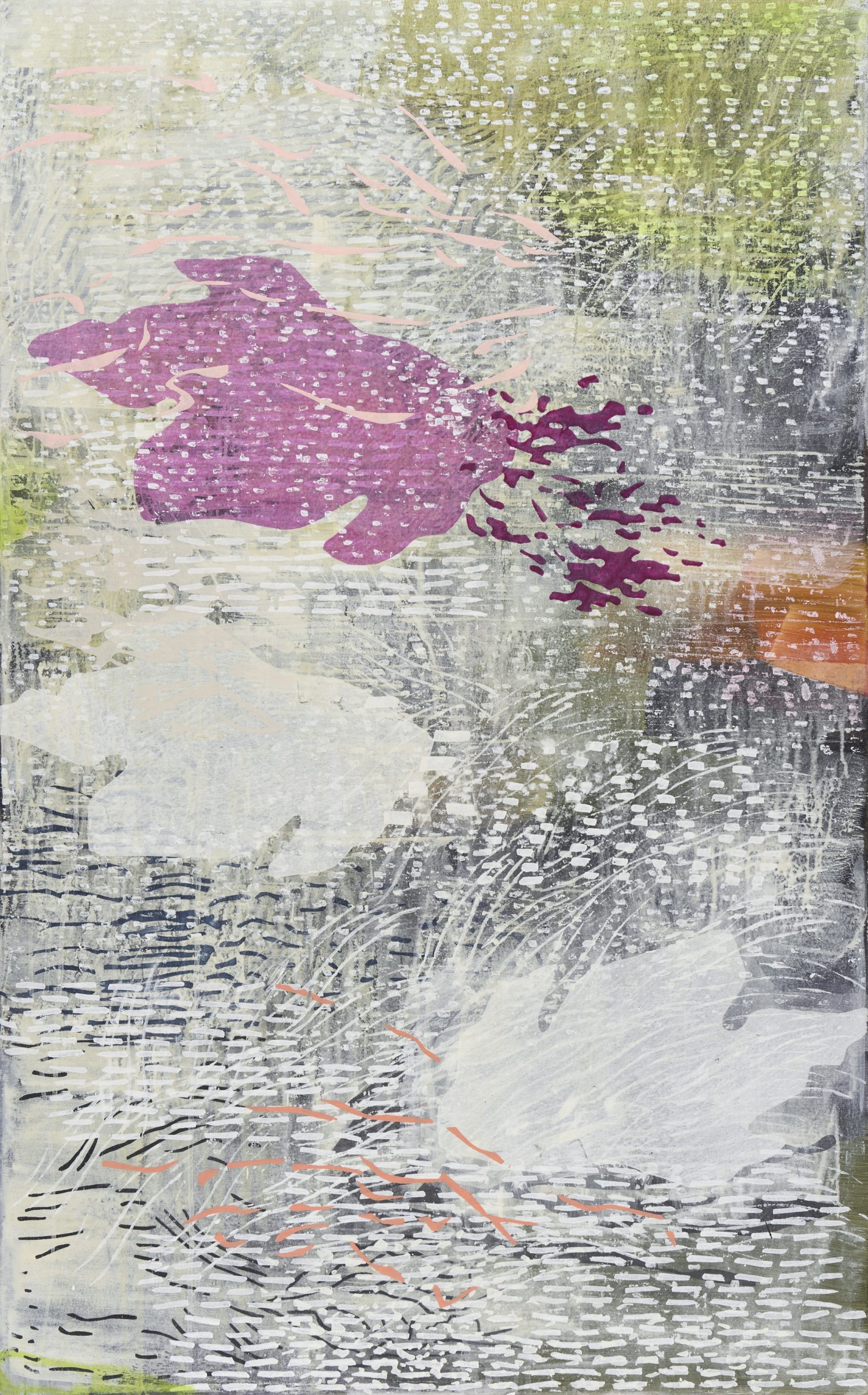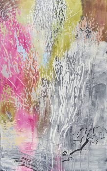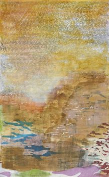 Laura Fayer’s paintings draw on various structures and systems to produce a loose geometry with organic rhythms. She relies mainly on her hand-crafted tools such as stencils and over-sized rubber stamps to construct her multi-layered paintings. As part of her process, she studies the natural and built environment; among her many references are architecture, aerial views of the landscape, language and weather. She also draws upon her memories of childhood years in Japan: her paintings reflect the wabi-sabi aesthetic–a Japanese concept of beauty that includes simplicity, unpretentiousness and imperfection.