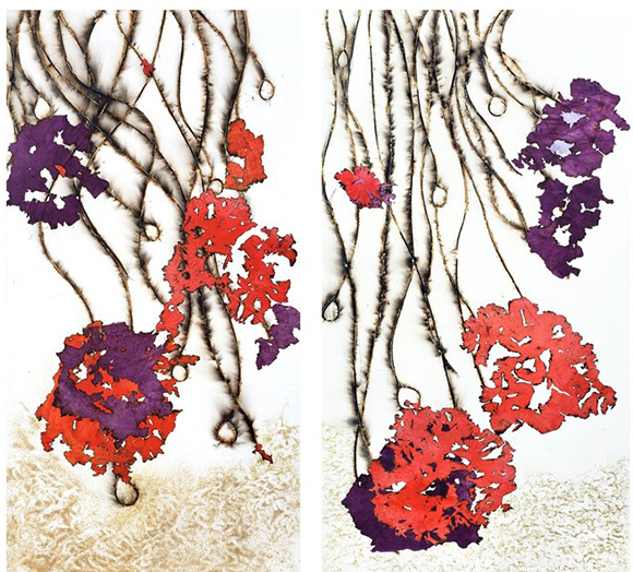 Lehr has been described as a visual poet. She uses nature based images to explore the possibilities of painterly experiments. The subtle color harmonies combined with veils of Japanese paper contrast with the expressionistic splashes, drips, and fluidity of the grounds. The tensions balanced between the abstract and the illusion, the hidden and the revealed, the hard edged and the soft focus all add to the mystery and the resonance of the work.