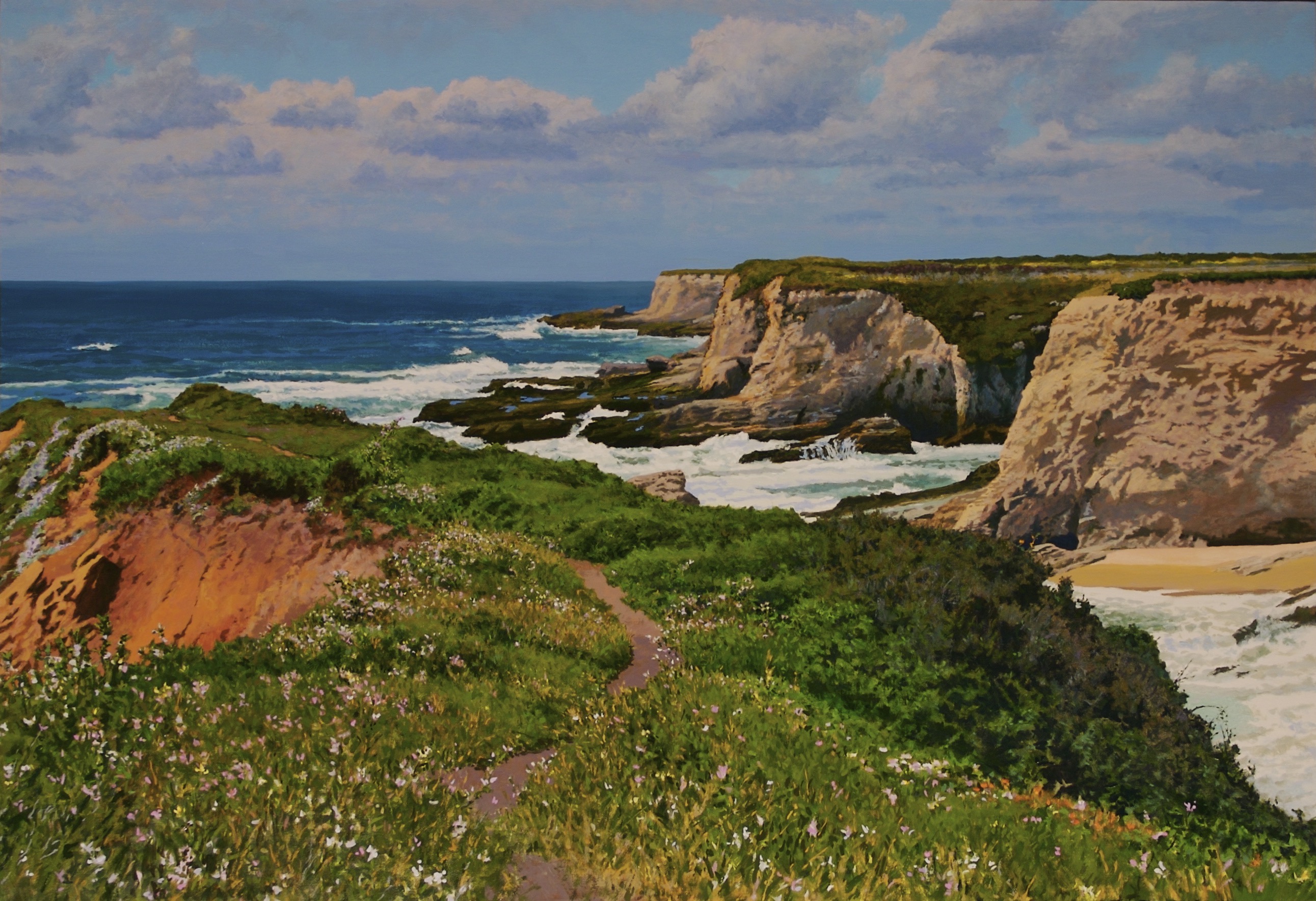 I love the paradox of making an illusion of light, space, and atmosphere out of paint on a flat canvas surface. To make an illusion that looks almost photographic from a distance, but dissolves into mysterious paint surfaces upon close inspection is what I delight in. Seen up close, the surface of my big paintings reveals a final product made up of multiple layers of color that still show through in places. This can offer insights to the decision making process my picture making entails. I juxtapose transparent, translucent, and opaque passages to enhance this effect.”