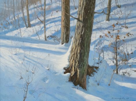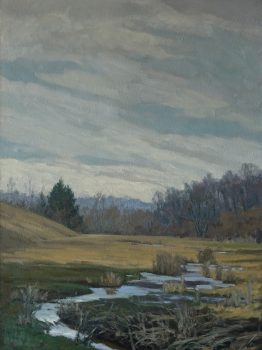 Ron Donoughe’s prolific landscapes feature Western Pennsylvania, where he has painted for thirty years. Painting daily outdoors, Donoughe captures the landscape during various seasons and times of the day. To Donoughe, “being present with the subject infuses a painting with a genuine quality” that conveys “the beauty and austere feeling of the landscape at the end of a long winter.”