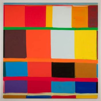 American abstract painter Stanley Whitney creates bold, abstract images comprised of unmediated squares of pure color. His interest in color relates to several abstract traditions form the twentieth century, particularly color field painting and minimalism, but Whitney also draws on many other sources, both from within the visual arts and elsewhere. Music, especially jazz, has been a significant source of inspiration to Whitney. There is an undeniably musical quality to Whitney’s paintings: the spacing and size of his squares create a distinct rhythm, the colors each suggest a different note, and the relationship of the squares of color to one another is reminiscent of musical harmonies.