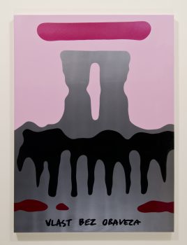 Žolt Kovac is a Serbian painter currently living, working and studying in Belgrade. His three pieces for the exhibition come from his Brilliant Painting Series and feature juxtapositions of wordplay and abstract forms.